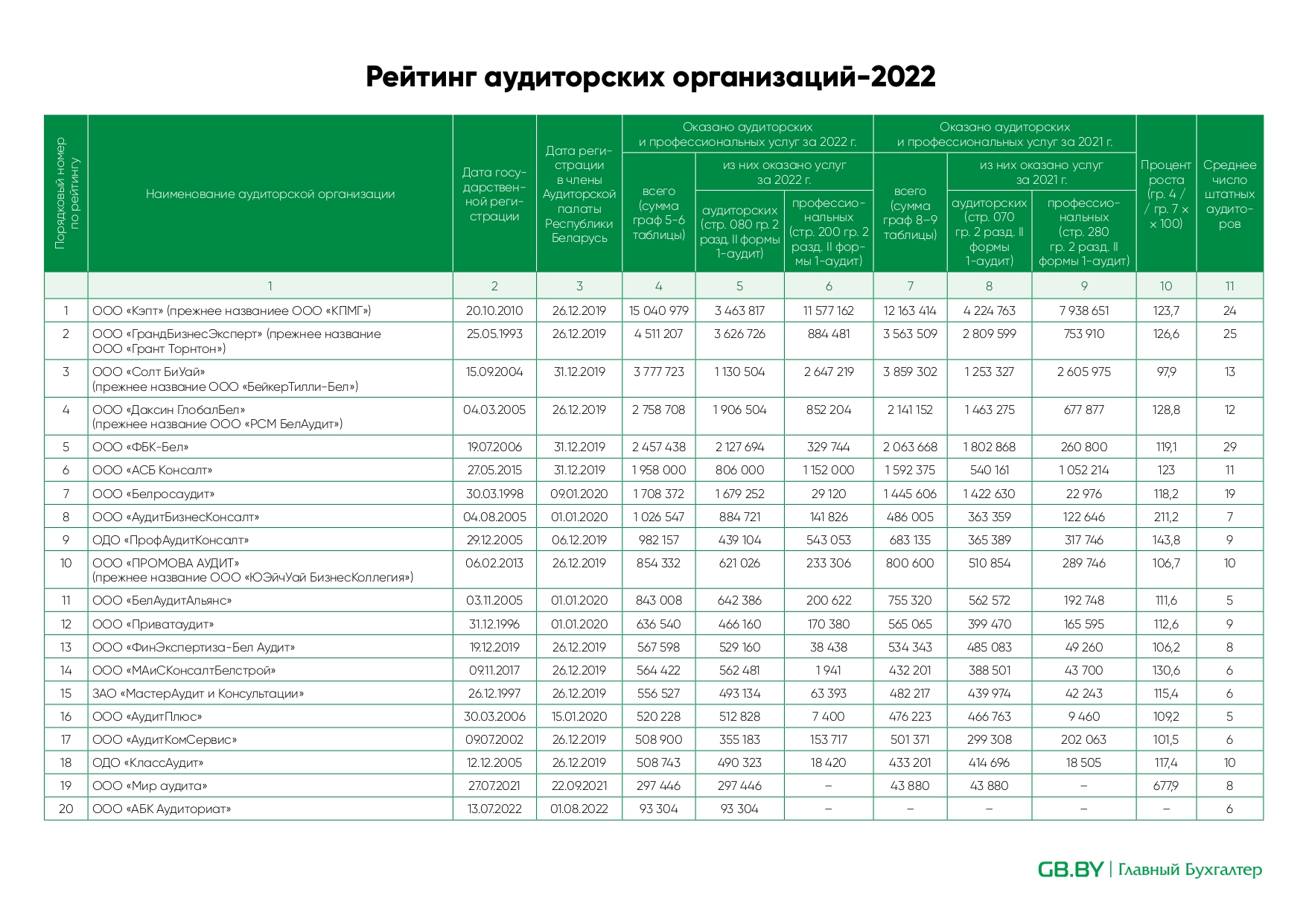 На основании информации, поступившей в адрес редакции журнала «Главный Бухгалтер», сформирован рейтинг организаций, оказывающих аудиторские услуги, по итогам работы за 2022 г. Такой рейтинг публикуется ежегодно и позволяет выделить наиболее крупные и значимые аудиторские компании. В Рейтинге за 2022 год приняли участие 20 аудиторских компаний из 67 зарегистрированных в Аудиторской палате Республики Беларусь на конец апреля 2023 года.